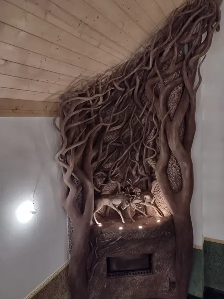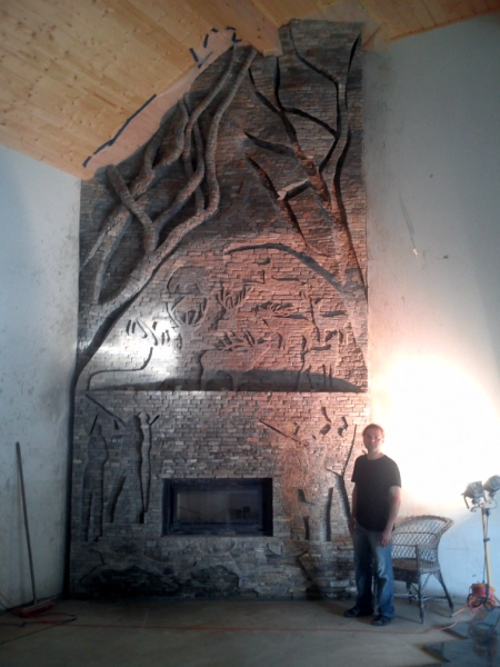 W mojej pracowni projektuję i wykonuję artystyczne obudowy kominkowe dla osób prywatnych, postrzegając kominek jako centralny punkt domowego ogniska. Każdy kominek jest indywidualną rzeźbą użytkową, integrującą płaskorzeźbę z funkcją grzewczą, dzięki czemu moja oferta wykracza poza standardowe rozwiązania. Kluczowym aspektem jest wykorzystanie materiałów naturalnych, takich jak piaskowiec, kamień i drewno, które pod wpływem ciepła zyskują dodatkowy blask. Stosuję również nowatorskie połączenie technik malarskich z fakturowaniem tynku, co nadaje obudowom unikalny, rzemieślniczy charakter. Każdy detal jest dopracowywany ręcznie za pomocą noży, dłut i pędzli.