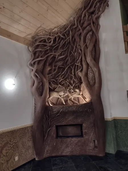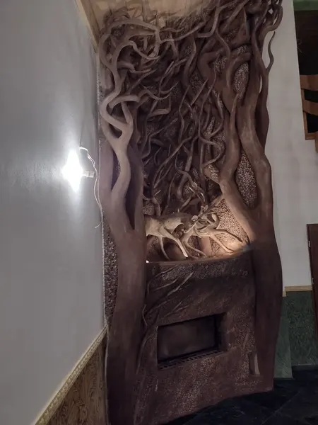 - Artystyczna obudowa kominka łączy funkcję grzewczą z unikatową formą rzeźbiarską.